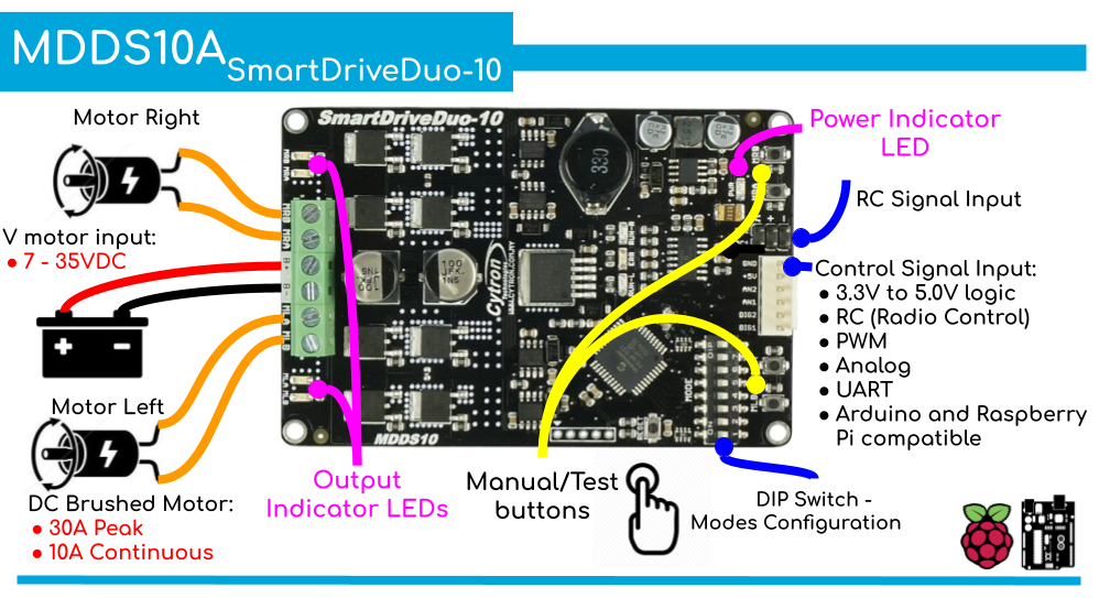 Características del Controlador de Motor DC 10A 7V–35V SmartDrive de 2 Canales