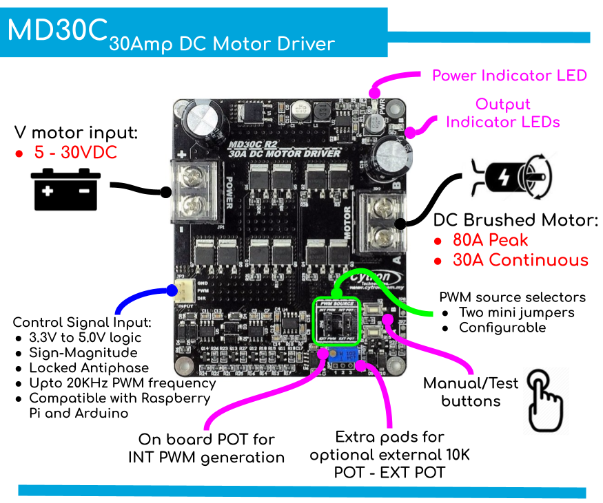 El Controlador de Motor DC 30A 5V–30V de 1 Canal es compatible con múltiples tipos de señales de control, como PWM, señales analógicas, microcontroladores y sistemas RC. Esto permite emplearlo con plataformas como Arduino, Raspberry Pi, PLCs, radios de modelismo y otros controladores embebidos. Sus indicadores LED facilitan la supervisión visual del funcionamiento del motor, ayudando a estudiantes y desarrolladores a diagnosticar dirección, actividad y estados de funcionamiento en tiempo real.