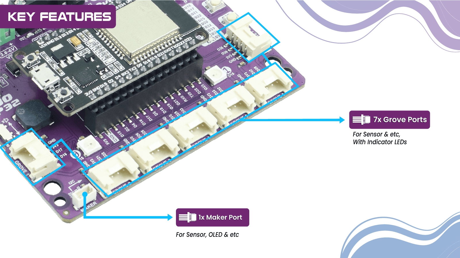 El controlador incluye puertos de expansión Grove, una interfaz plug-and-play compatible con multitud de sensores y actuadores. Esto reduce el cableado, evita soldaduras y facilita el aprendizaje para estudiantes.